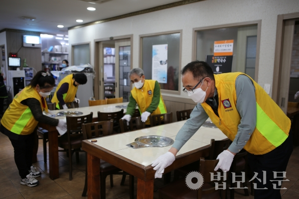 부산불교교육대학(학장 평천 범혜 스님)은 4월2일 서면 일대 부산불교교육대학 출신 불자들이 운영하는 식당에서 ‘코로나19 예방을 위한 방역 봉사’를 전개했다. 이날 방역 봉사에는 부산불교교육대학장 범혜 스님을 비롯해 김춘식 부산불교교육대학 불교문화학과 교수와 교육대학 실무자 등이 참석해 지역 사회의 코로나19 예방을 발원하며 봉사 활동을 펼쳤다. 방역 소독제 및 방역 기계 지원은 김해 지역에서 방역 봉사를 전개하고 있는 ‘코로나19 방역 캠페인’에서 맡았다. 이에 캠페인을 담당하는 김범준 ‘코로나19 방역 캠페인’ 팀장과 자원봉사자 등도 봉사에 함께했다.