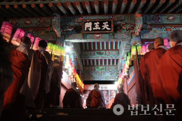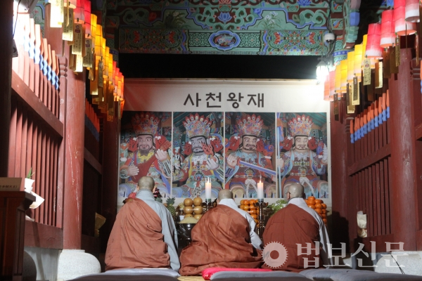 범어사(주지 경선 스님)는 1월27일 경내 천왕문에서 ‘사천왕재’를 봉행했다. 도량의 안전을 기원하기 위해 매년 음력 12월 보름에 맞춰 저녁예불 이후 봉행해 온 이 법석은 특히 이번에는 부산 시민의 평안 기원은 물론 코로나19 극복을 염원해 의미를 더했다. 법회에는 종교시설 사회적 거리두기 지침에 따라 범어사 주지 경선 스님을 비롯한 사중 스님들이 참석한 가운데 코로나19 예방 수칙을 준수하며 거행됐다.
