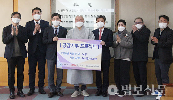 생명나눔실천 부산지역본부(본부장 심산 스님)는 2월19일 부산 국제신문에서 ‘공감기부 프로젝트 사업실적 확인 및 교류식’을 가졌다. 이날 세 기관은 지난 6년 동안 이어온 난치병 환우 치료비 지원 사업을 앞으로도 꾸준히 이어가기로 뜻을 모았다. 이 자리에는 생명나눔실천 부산지역본부장 심산 스님과 이영숙 이사를 비롯해 신정훈 부산은행 팀장, 김지근 과장, 배재한 국제신문 이사, 오상준 편집국장 등이 참석했다.
