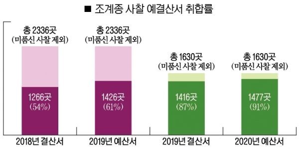 이는 전년도에 비해서도 크게 늘어난 수치다. 조계종 총무원의 ‘2018년 결산서 및 2019년 예산서 취합현황’(2019년 9월30일 기준)에 따르면 주지 미품신 사찰을 제외한 사찰의 2018년 결산서 취합률은 54%, 2019년 예산서 취합률은 61%에 그쳤다. 총무원이 사찰 예결산서 작성의 중요성을 강조하며 꾸준히 행정지도를 한 결과라는 시각이 있다. 그러나 사설사암이나 종무행정이 미약한 소규모 사찰의 경우 여전히 예결산서 제출을 하지 않고 있어 이에 대한 보완이 필요하다는 지적도 있다.