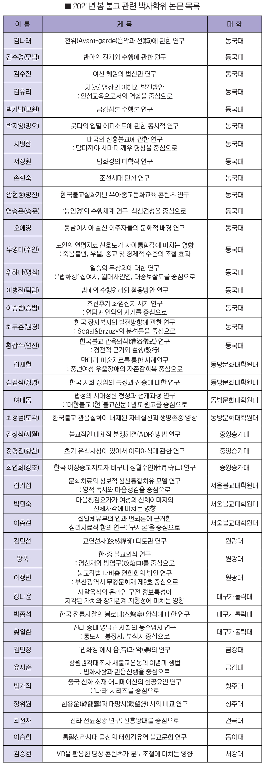 대학별로는 동국대가 18명으로 가장 많았다. 동방문화대학원대가 4명, 중앙승가대·서울불교대학원대·원광대·대구가톨릭대가 각 3명, 금강대·청주대가 각 2명으로 뒤를 이었다. 건국대·동아대·서강대에서도 각 1명의 불교박사가 나왔다.