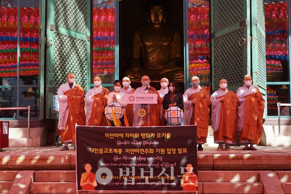 조계종은 3월16일 서울 조계사 대웅전 앞마당에서 총무부장 금곡 스님이 발표한 입장문을 통해 “2월1일 미얀마에서 군부 쿠데타가 발생했고 지금 이 순간에도 수많은 미얀마 국민이 거리에서 피를 흘리며 쓰러져 가고 있다”며 이같이 밝혔다.