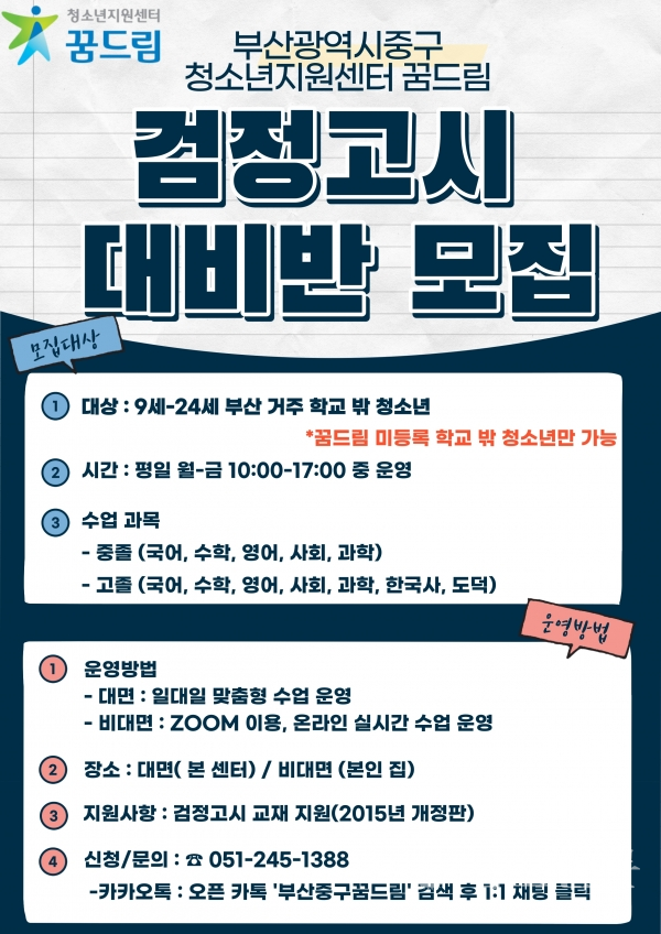 부산 중구 꿈드림은 9세에서 24세 학교 밖 청소년을 대상으로 검정고시 대비 ‘스마트교실’ 프로그램을 운영하며 참여자를 모집 중이다. 이밖에도 상담지원, 교육지원, 자립지원, 건강지원, 급식지원 등 다양한 사업을 전개한다.