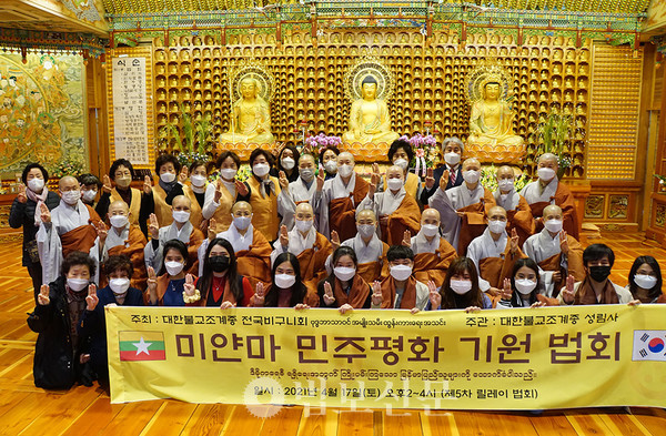 조계종 전국비구니회(회장 본각 스님)가 주최하는 미얀마 민주항쟁 지지 릴레이 기도법회의 다섯 번째 법석이 4월17일 마포 성림사(주지 현담 스님)에서 봉행됐다. 서울 전국비구니회관 법룡사와 서울 옥수동 미타사에 이어 성림사에서 봉행된 법회에 참석한 동참자들은 미얀마 현지의 민주화운동과 탄압상이 담긴 동영상 등을 함께 시청하며 미얀마에 하루 빨리 평화가 깃들기를 기원했다. 법회에는 전국비구니회장 본각, 운영위원장 상덕, 전국비구니회 부회장 광용(성림사 회주), 한국비구니승가연구소장 수경, 성림사 주지 현담 스님을 비롯해 전국비구니회 집행부 스님들과 행동하는미얀마청년연대, 재한미얀마유학생협회, 중앙미얀마학생연합회 소속 미얀마 학생과 청년 등 9명도 자리를 함께했다.