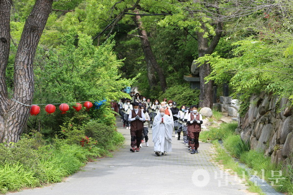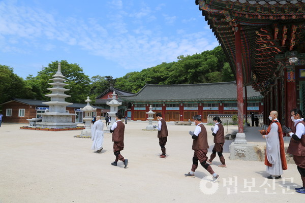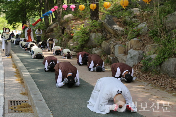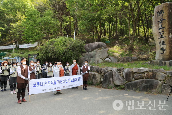 성주사(주지 법안 스님)는 4월24일 경내 일대에서 ‘성주사 코로나19 소멸을 위한 삼보일배 법회’를 봉행했다. 성주사 불교대학과 불모학당 재학생들의 신심 증진을 위해 강의 프로그램으로 기획된 삼보일배 정진은 성주사 차원에서는 지난해에 이어 두 번째로 마련됐다. 이 자리에는 성주사 주지 법안 스님과 성주사 불교대학 불모학당 졸업 예정자, 성주사 신도 등이 동참해 코로나의 종식을 발원하고 미얀마의 평화를 기원했다.
