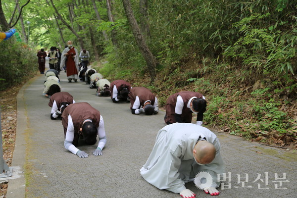 삼보일배는 2시간에 걸쳐 전개됐다. 성주사 입구 주차장에서 입재식을 가진 뒤 깨달음의 길과 도량 입구 그리고 지장전을 지나 탑 앞에서 회향식을 가졌다.
