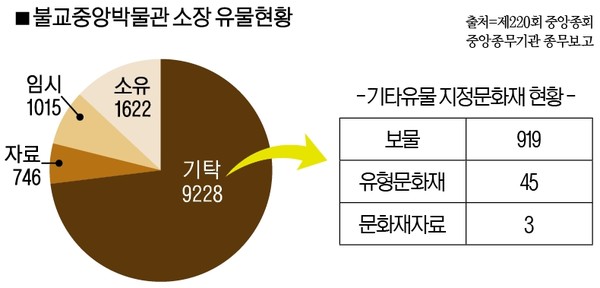 불교중앙박물관은 특히 전국 성보박물관을 대표하는 기관으로 지방 성보박물관 및 사찰에서 관리가 어려운 문화재를 안정적으로 보존하는 역할을 담당하고 있다. 지난 3월 조계종 중앙종회에 보고된 유물관리현황에 따르면 불교중앙박물관은 현재 소유유물 708건 1622점, 기탁유물 1170건 9228점, 자료 206건 746점, 임시보관 723건 1015점 등 총 2807건 1만2611점의 성보를 소장하고 있다.