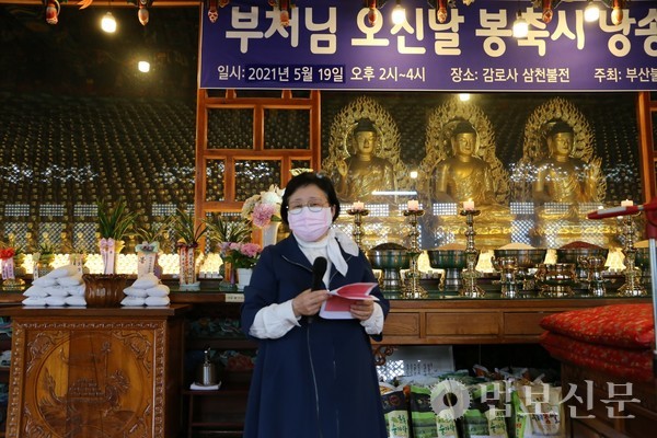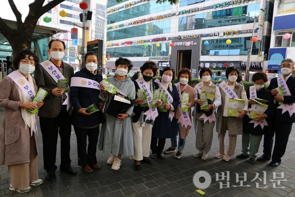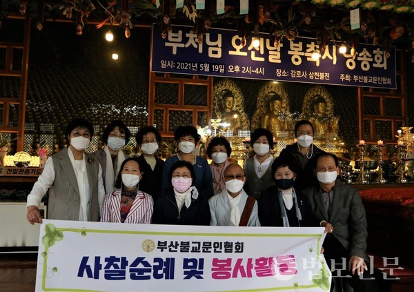 부산불교문인협회(회장 차정연)는 4월28일 부산 감로사에서 ‘불기 2565년 사찰순례 법회 및 봉사활동’을 전개했다. 이날 회원들은 전 조계종 포교원장이며 감로사 주지 혜총 스님의 법문을 듣고 연등 만들기를 체험하며 부처님오신날을 봉축했다. 특히 법회 이후에는 부산 중심가인 서면로터리 일대에서 마스크 나눔도 실천했다. 부산불교문인협회는 이날을 비롯해 봉축 기간인 5월 한 달 동안 총 마스크 3000여 장을 시민들에게 나누며 부처님오신날의 자비 광명을 전하고 시민의 건강과 행복을 기원할 예정이다.