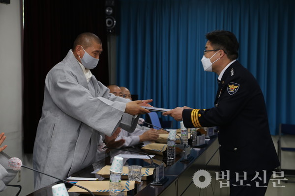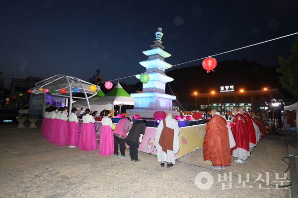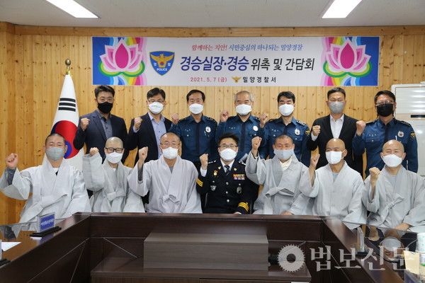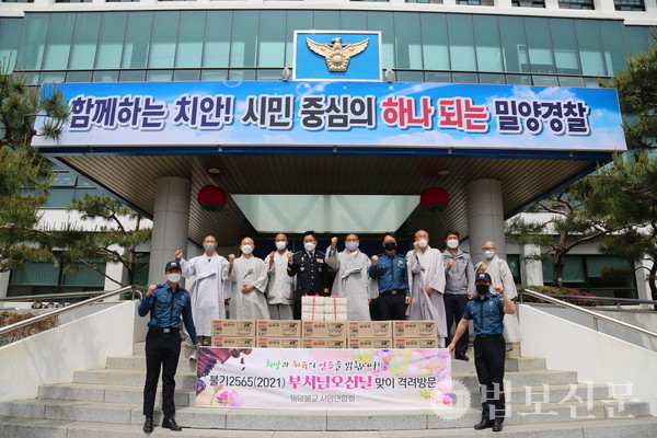 밀양불교사암연합회(회장 진각 스님)는 5월7일 ‘불기 2565년 부처님오신날 봉축 연합법회 및 자비 나눔’을 봉행했다. 이날 연합회는 밀양경찰서, 밀양소방서를 찾아 봉축 위문품을 전달하며 시민의 안전을 위해 힘쓰는 경찰과 소방대원을 격려했다. 밀양경찰서에서는 경승실장 진각 스님을 비롯한 신임 경승 위촉식도 마련됐다. 이어 오후에는 밀양역 앞에서 밀양 시민의 건강과 안녕을 기원하는 봉축 점등식도 봉행됐다.