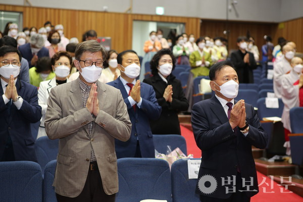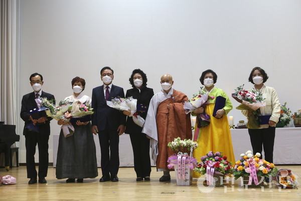 특히 시상식 순서에서는 부산불교연합회와 부산불교총연합신도회가 공동으로 주최하는 제3회 부산불교대상 시상식이 마련됐다. 대상은 김수현 불교여성개발원 부산지원장이 수상했다. 김 지원장은 “귀한 상을 받게 되어 어깨가 무겁다”며 “이 상금은 뜻있는 일에 회향할 수 있도록 하겠다”고 소감을 전했다. 또 최우수상은 범어사 금강암 장학회(회장 허봉희), 우수상은 강미자 금정총림포교사회장, 삼광사 봉사회(회장 김말희), 현익채 전 금정중학교 교장이 각각 수상했다.