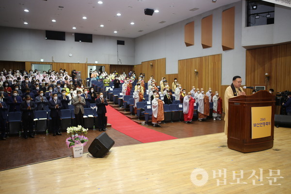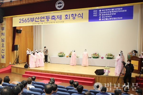 부산광역시불교연합회(회장 경선 스님)는 5월16일 부산 자유회관 1층 대강당에서 ‘불기 2565년 부처님오시날 부산연등축제 회향식’을 봉행했다. 이날 행사는 송상현광장 부산연등문화제 특설무대에서 진행될 예정이었으나 우천으로 인해 장소를 옮겨 전개됐다. 법석에는 부산불교연합회장 경선 스님, 상임부회장 진광 정사(진각종 부산교구청장), 마나 스님(태고종 부산종무원장) 등 대덕 스님, 박형준 부산시장, 신상해 부산시의회 의장, 김석준 부산시교육감, 박수관 부산불교총연합신도회장 등 신도회 회장단, 김수현 불교여성개발원 부산지원장, 하정선 불교TV염불공양모임 회장 등 신행단체장이 참석했다.