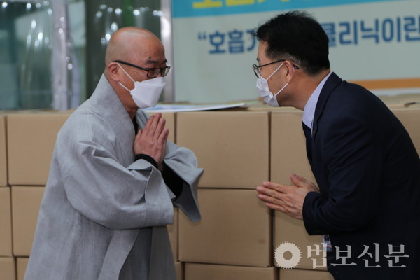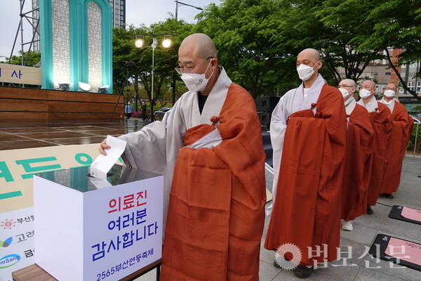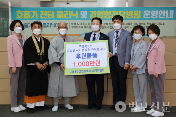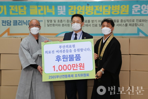 부산광역시불교연합회(회장 경선 스님)는 5월17일 부산의료원(원장 노환중)에 ‘불기 2565년 부산연등축제 릴레이 약사기도 회향 기념 코로나 극복 의료진 위문품 전달식’을 개최했다. 이날 부산불교연합회는 총 1000만 원 상당의 간식 등으로 구성된 위문품과 부처님오신날을 기념해 만든 느티떡을 코로나19의 종식을 위해 최일선에서 노력하는 부산의료원 의료진을 위해 보시했다. 전달식에는 부산불교연합회 사무총장 보운 스님, 사무부총장 영준 국원(일본 진여원 부산분원) 등이 참석해 의료진의 건강을 기원했다.