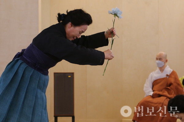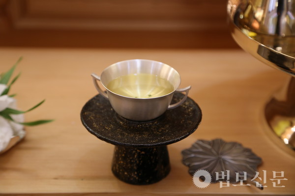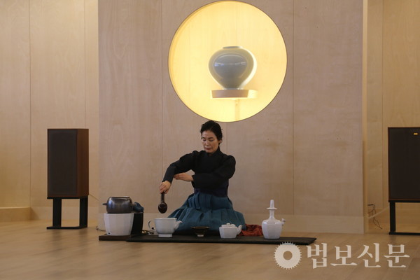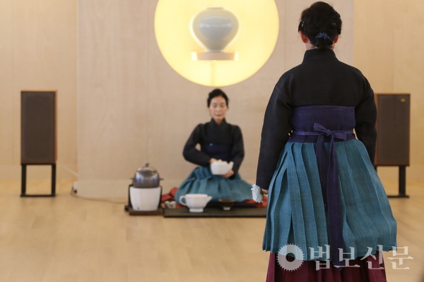 이날 차행법숙우회는 대웅보전에서 ‘해도(海濤)’ 다법으로 차와 향, 꽃을 불전에 공양했다. 이어 선차실에서는 여러 사람이 함께 차를 마시고 명상에 드는 선차 다법 가운데 선방의 죽비를 꽃으로 표현한 ‘염화(拈華)’ 다법을 시연했다. 시연에 앞서 공개된 선차실의 현판은 ‘여수동좌(與誰同坐)’라는 북송시대 시인 소동파의 시에 나오는 구절로 윤영화 통도사 승가대학 서예 강사가 쓴 글씨로 제작됐다. 윤영화 강사는 바라밀선원 3층 대웅보전의 ‘금강경 후불 금니사경’ 조성을 맡기도 했다.