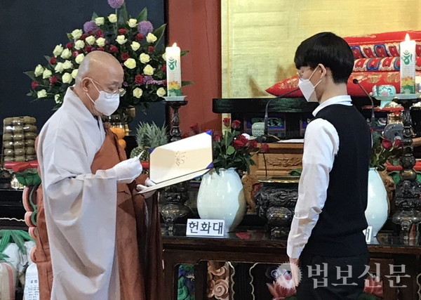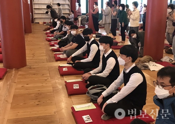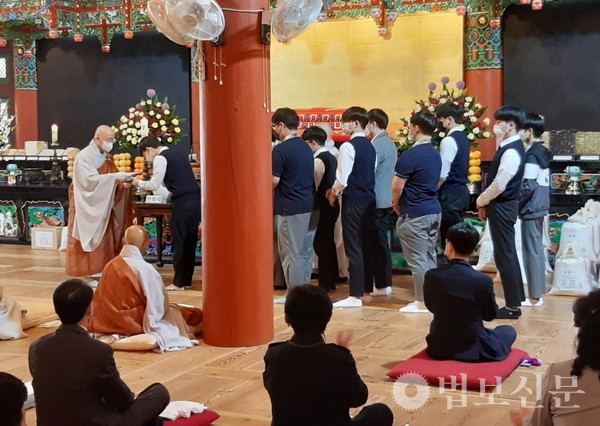 재단법인 영축문화재단(이사장 현문 스님)은 5월19일 영축총림 통도사 설법전에서 봉행된 ‘불기 2565년 부처님오신날 봉축 법요식’에서 ‘영축문화재단 2021학년도 장학금 전달식’을 봉행했다. 이 자리에서 재단은 영축학원 산하 부산 해동고 재학생 10명에게 각 50만 원씩 총 500만 원의 장학금을 전달하고 심신의 건강한 성장을 기원했다.