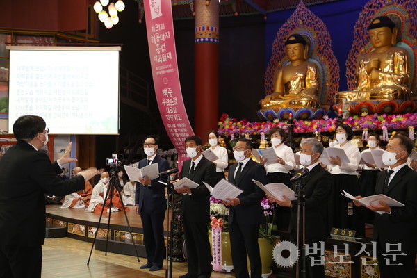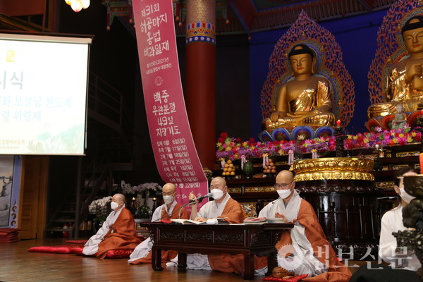 부산 홍법사(주지 심산 스님)는 6월6일 경내 대광명전에서 ‘제31회 허공마지 홍법 바라밀재’를 봉행했다. 이날 법회는 그동안 야외에서 봉행해 온 법석 대신 거리두기 수칙을 준수하며 실내인 대광명전에서 봉행됐다. 이 자리에는 전 조계종 포교원장 혜총, 홍법사 주지 심산 스님을 비롯한 사중 스님들과 김건웅 홍법사 신도회 고문, 이영숙 수석부회장, 김수현 불교여성개발원 부산지원장 등이 참석했다. 의식은 불공, 개회사, 추모 헌다에 이어 호국영령을 위한 묵념, 경과보고, 기념사, 인사말, 음성공양, 시식 등으로 전개됐다. 창건주 하도명화 보살 추모재와 홍법사 백중기도 입재도 겸했다.