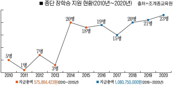 교육원(원장 진우 스님)이 공개한 2010~2020년 장학승 지원현황에 따르면 조계종이 종단 스님들에게 지원하는 장학금은 해마다 증가추세를 보였다. 2010~2015년 5년간 장학금 총액이 5억7500여만원에 그쳤지만 2016~2020년은 2배 가량 증가한 10억8000여만원에 달했다. 장학혜택을 받는 스님도 2010~2015년 54명이었지만, 2016~2020년은 98명으로 큰 폭으로 늘었다. 지난 10년간 종단 장학승은 총 152명으로 이 가운데 국내 대학원에 재학 중인 스님이 72명으로 가장 많았고, 사찰승가대학원이 45명, 해외 대학원이 35명으로 집계됐다.