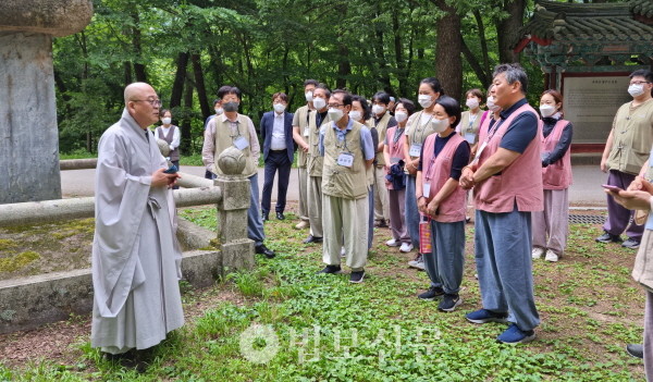 오전 7시경 아침공양과 간단한 기념촬영을 끝내고 사찰탐방에 나선 대원들은 각운 스님을 따라 경내 이곳저곳을 순례했다. 보물 마애여래의좌상과 스님 3000명의 식사를 책임졌다는 철솥을 비롯해 국보 석련지와 쌍사자석등, 팔상전 등 법주사의 다양한 성보들에 대한 각운 스님의 설명을 들으며 대원들은 연신 고개를 끄덕이고 탄성을 쏟아냈다.