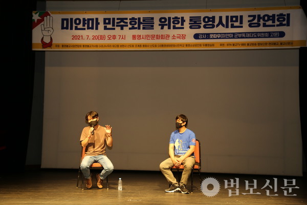 통영불교사암연합회(회장 종묵 스님)·통영불교거사림(회장 안휘성)·사단법인 나누우리·조계종 용화사·태고종 보현사 신도회 등은 7월20일 경남 통영시민문화회관 소극장에서 ‘미얀마 민주화를 위한 통영시민 강연회’를 개최했다. 이 강연회는 통영지역 불교단체와 사찰이 뜻을 모으고 통영생태문화시민학교, 통영소상공인회등 시민단체와 향토 기업 단체도 연대해 공동 주최로 성사됐다.