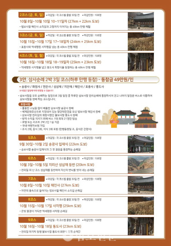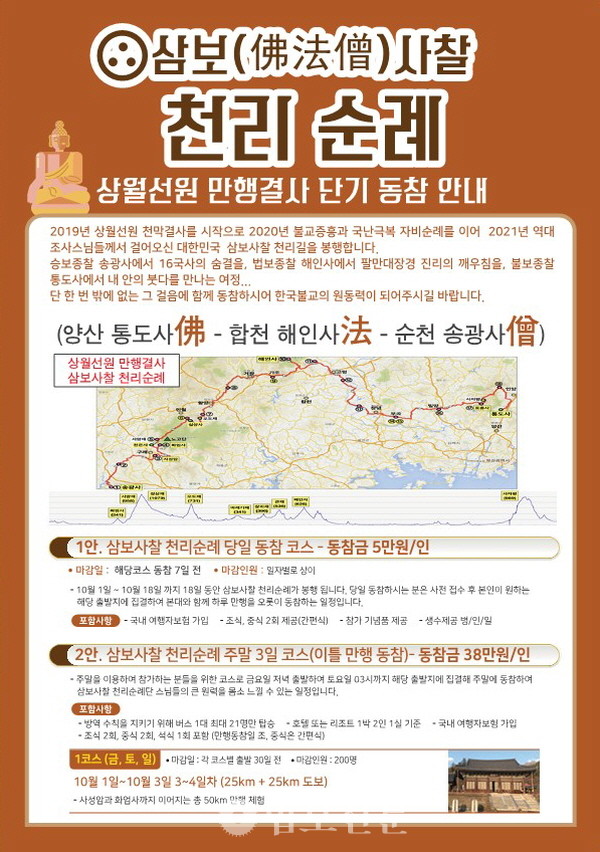 대승마야투어는 “삼보사찰은 지금도 스님들이 거주하며 수행하는 모습을 볼 수 있는 세계에서 유일하게 ‘살아있는 성지’이며 이런 점에서 천리순례 경로는 생동감이 넘치는 순례길”이라며 “많은 불자들이 동참해 미래불교중흥을 위한 원력 결집의 현장을 직접 체험하고 이를 통해 불자로서의 자긍심을 키우는 계기가 되길 바란다”고 밝혔다. 02)730-0202. 1577-0206.