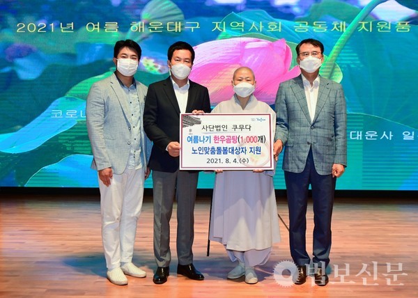 이날 쿠무다는 해운대구청을 통해 지역 내 취약계층 돌봄 어르신의 여름나기를 발원하며 건강식 1000인분을 보시했다. 이 자리에는 쿠무다 이사장 주석 스님과 홍순헌 해운대구청장 등이 참석해 어르신들의 건강한 여름을 응원했다.