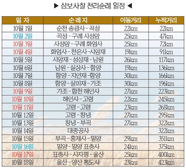 관련기사 정혜결사도량 송광사서 불교중흥 발원 천리순례 첫발 내딛다 [천리순례 5일차] 우직한 소걸음으로 지리산 넘어 남원에 닿다 [천리순례 6일차] 실상사 맑은 종성 뒤로 하고 깨달음의 길에 서다 [천리순례 14일차]사부대중, 한국불교 위기극복 위해 머리 맞댔다