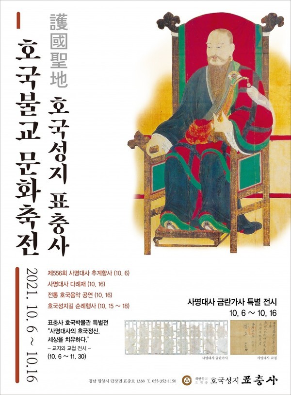 밀양 표충사(주지 진각 스님)는 10월6일부터 16일까지 경내 일대에서 ‘호국성지 표충사 호국불교 문화축전’을 봉행한다. 이 법석은 서산·사명·기허 대사의 호국정신을 기리는 향사를 시작으로 사명대사의 유품을 소개하는 표충사 호국박물관 특별전 개막 그리고 삼보사찰 천리순례단과 함께하는 다양한 호국 문화 축제로 전개된다.