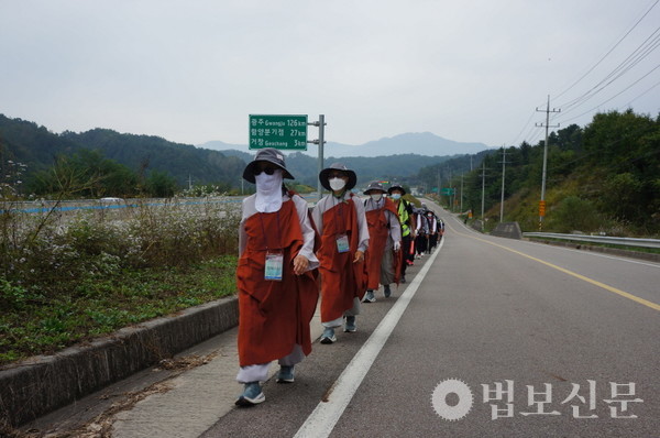 가을 풍경을 눈에 담으며 걷는 순례단에게 법보종찰 해인사까지 남은 거리는 27km. 순례단은 가조패밀리관광호텔에서 바랑을 내리고 8일차 순례를 회향했다.