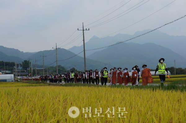 황금빛 물들어가는 가을 들녘 속으로 나아갔다. 상월선원 만행결사 삼보사찰 천리순례는 10월8일 30km를 행선해 가야산이 품은 두 번째 목적지 법보종찰 해인사 초입의 거창군 가조면에 도착했다.
