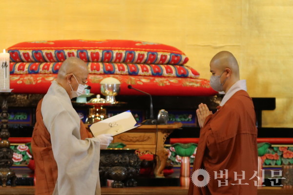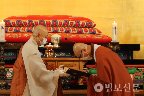 통도사(주지 현문 스님)는 9월18일~10월17일 경내 일대에서 ‘제1376주년 개산대재 – 천년의 문화를 함께 나누다’를 봉행했다. 특히 10월14일 설법전에서는 ‘제1376주년 영축총림 통도사 자장율사 영고재 및 법요식’이 봉행됐다. 이 자리에는 영축총림 방장 성파, 전 방장 원명, 주지 현문, 전계사 혜남, 유나 항조, 노전 광우, 승가대학장 인해, 염불원장 영산 스님을 비롯해 산중 대덕 스님들이 두루 참석했다. 김일권 양산시장, 윤영석 국회의원 등 재가 내빈 및 통도사 신행단체장도 동참했다. 사회적 거리 두기와 방역 수칙에 의거해 진행된 법회는 통도사 창건조사 자장율사를 기리는 영고재, 헌향 및 헌다, 봉행사, 내빈 축사, 축가, 영축장학금 전달식, 지역 공로자 공로패 수여식, 나도작가다 시상식 등으로 전개됐다.