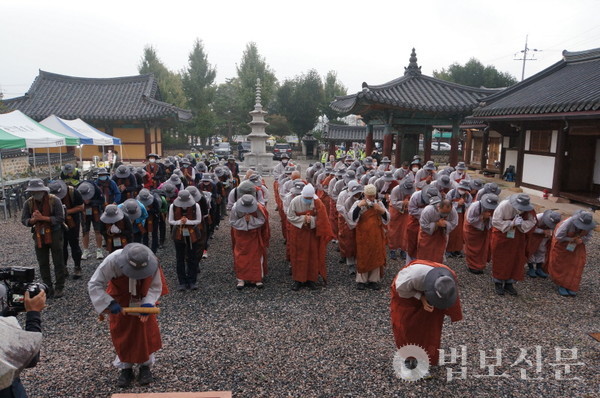 상월선원 만행결사 삼보사찰 천리순례단이 10월15일 10번째 기착지인 경남 밀양에 도착했다. 순례단은 이날 29km를 더해 지금까지 351km를 행선했다.