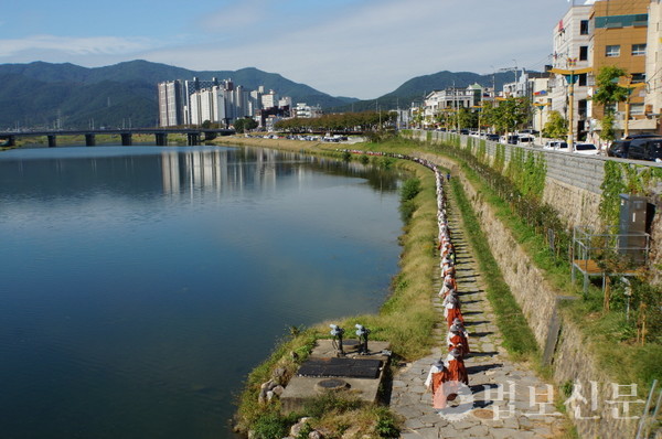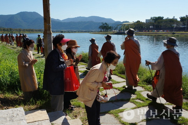 밀양천에 들어서자 수변공원 곳곳에는 무봉사, 보문사, 용궁사 등 밀양사암연합회 사부대중이 순례단을 맞이했다. 무봉사 신도 신영자 불자는 80세 나이에도 순례단 한명한명에게 합장 반배로 인사를 전했다. 신영자 불자는 “송광사에서 해인사, 다시 통도사까지 천릿길을 걷고 수행하며 순례하는 스님과 불자들을 직접 보고 싶었다”며 “어렵고 힘든 길 끝에 바라는 바 성취하시고 부처님의 가피가 가득하길 기원한다”고 말했다.