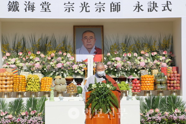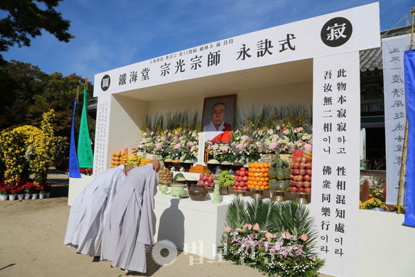 10월26일 오전 11시, 경주 기림사 천불전 앞에 마련된 영단. 사람들의 비통한 심정을 아는지 모르는지 영정 속의 철해당(鐵海堂) 종광(宗光) 스님의 시선은 무심한 듯 경내를 굽어보고 있었다.
