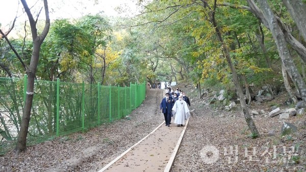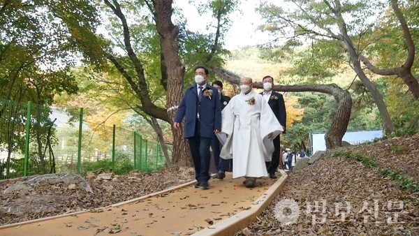 성주사(주지 법안 스님)는 11월1일 사찰 입구에서 ‘성주사 황토 숲길 준공식 기념 행사’를 가졌다. 이 황톳길은 성주사가 제안하고 창원시에서 지난 4월 착공, 설계 및 공사를 전개해 최근 조성이 마무리됐다. 왕복 구간 내에는 안전 난간과 야자매트, 세족장도 설치돼 있어 시민의 휴식 공간으로 가치를 더한다.