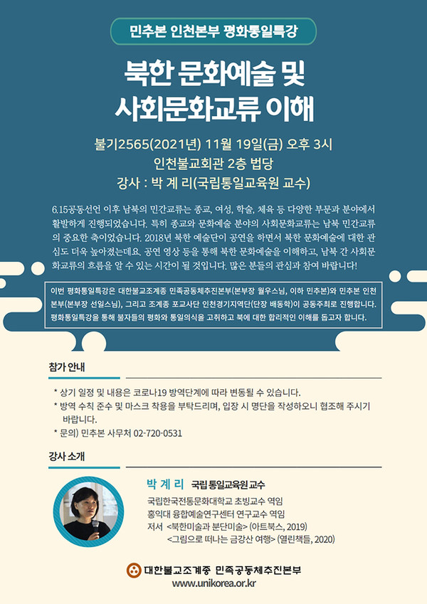 민추본과 인천본부가 함께하는 특강은 11월19일 오후 3시 인천불교회관 2층 법당에서 열린다. 강의는 ‘북한 문화예술 및 사회문화교류 이해’를 주제로 박계리 국립통일교육원 교수가 진행한다. 올해 5월4일 설립한 민추본 인천본부의 첫 평화통일특강으로, 인천지역 불자들의 통일의식 고취와 북한에 대한 합리적인 이해를 돕고자 마련됐다.