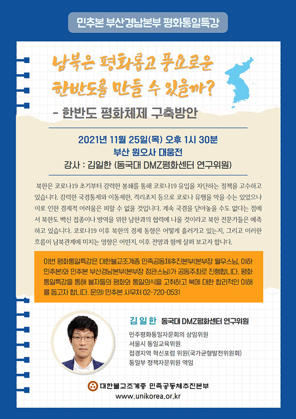 조계종 민족공동체추진본부(본부장 월우 스님, 이하 민추본)가 인천·부산 지역본부와 평화통일특강을 개최한다.