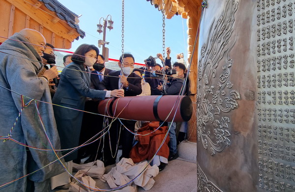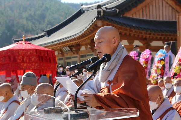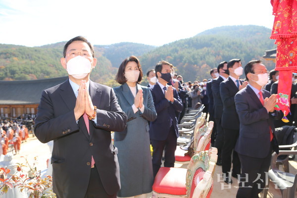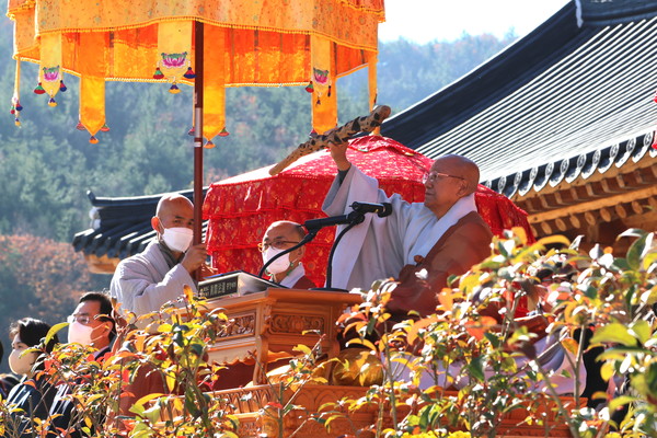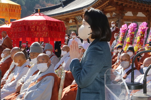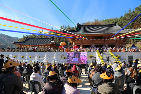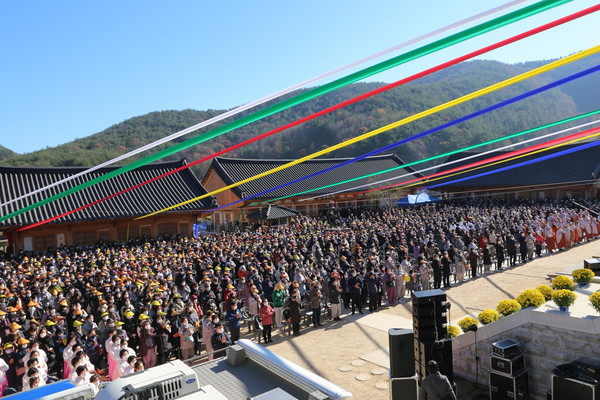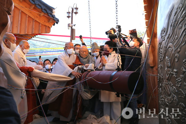 성담사(조실 진제 법원 대종사, 주지 도민 스님)는 11월28일 경내 대웅전 앞마당에서 ‘성담사 민족화합 조국평화통일 대범종 타종식 및 대작불사 회향 대법회’를 봉행했다. 법석에는 조계종 종정 진제 법원 대종사, 총무원장 원행, 팔공총림 동화사 회주 의현, 조계종 원로회의 명예원로의원 밀운, 원로의원 혜승, 대원, 원명, 성파, 법산, 지성, 동화사 주지 능종 스님을 비롯한 원로 대덕 스님들이 동참했다. 또 김혜경 이재명 대선 후보 부인, 이원욱 국회 정각회장, 주호영 정각회 명예회장, 김두관, 윤영석 국회의원 등 재가 내빈들도 참석해 성담사의 낙성을 축하했다.