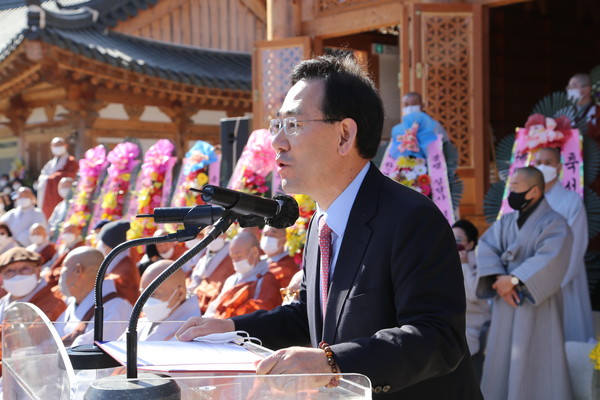 “오늘 성담사의 성역화 낙성식에 맞춰 ‘민족화합 조국평화통일 대범종’의 타종식을 봉행합니다. 세계 속에서 우뚝 솟는 대한민국을 염원하는 그 생각은 여와 야가 똑같다는 의미로 여당과 야당이 같이 한 줄을 잡고 타종하겠습니다.”