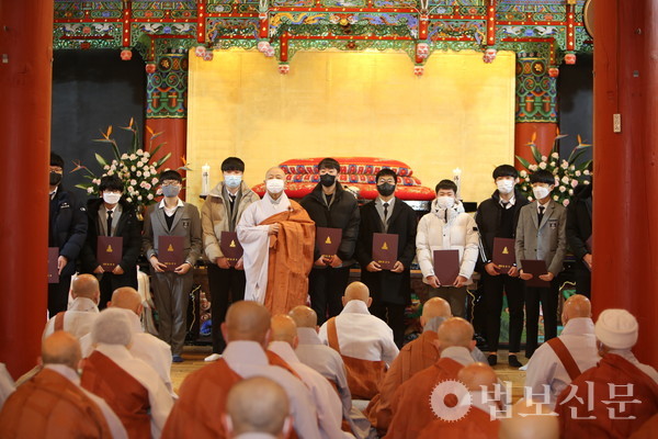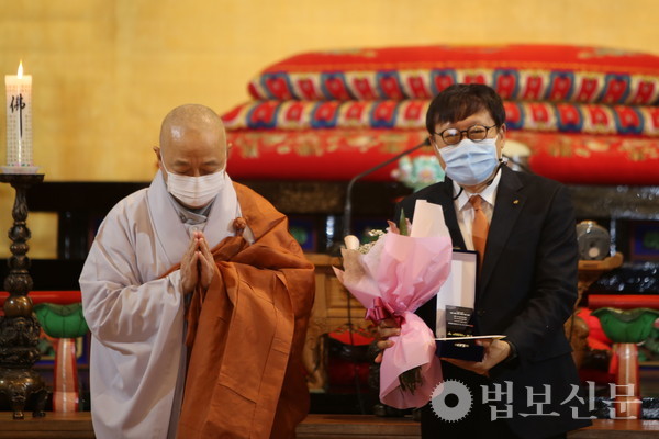 이날 영축문화재단은 김민서 군을 비롯한 해동고 재학생 10명에게 장학금을 전달하며 인재불사도 실천했다. 또 사회복지법인 통도사자비원과 울산시립노인요양원에 20여 년 동안 1억 원이 넘는 후원과 봉사활동을 이어 온 이정숙 불자에게는 통도사 주지 스님 감사패와 수안 스님의 선화 작품이 감사 선물로 전달됐다.