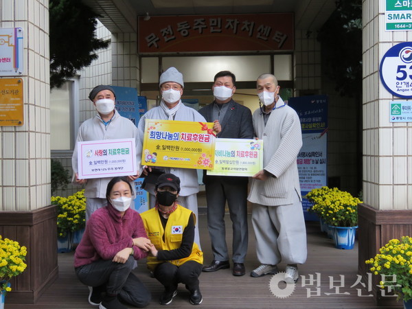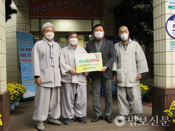 경남 통영 불교계는 12월15일 통영시 무전동사무소에서 ‘백혈병 환우를 위한 치료비 전달식’을 가졌다. 이 자리에는 통영 보현사 주지 묵원, 대성암 주지 승원, 연화사 주지 도법 스님 등 통영불교사암연합회, 사단법인 나누우리, 보현사 나누우리 봉사단 등이 참석해 환우의 쾌유를 발원했다. 이날 전달된 치료비는 총 380만 원이다. 통영불교사암연합회에서 180만 원, 사단법인 나누우리에서 100만 원, 통영 보현사 나누우리 봉사단이 100만 원을 마련했다. 이 기금은 송년을 맞아 통영불교계 각 단체에서 십시일반 기금을 모아 마련된 것이어서 자비 나눔의 가치를 더했다.