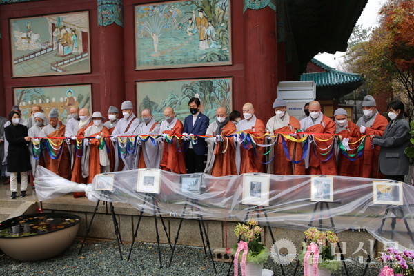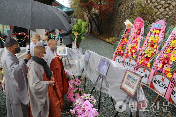 혜원정사(주지 원허 스님)는 12월16일 경내 방장실에서 ‘고산당 혜원 대선사 전시관 개관식’을 봉행했다. 이 자리에는 쌍계총림 쌍계사 주지 영담 스님을 비롯해 쌍계사 문도 스님들이 대거 참석해 전시관의 개관식을 기념하며 고산 대선사의 생전 가르침을 새겼다. 행사는 방장실 입구에 마련된 개관 기념 사진전 관람을 시작으로 테이프 커팅, 전시관 순례, 참배, 반야심경, 인사말 등의 순서로 이어졌다.
