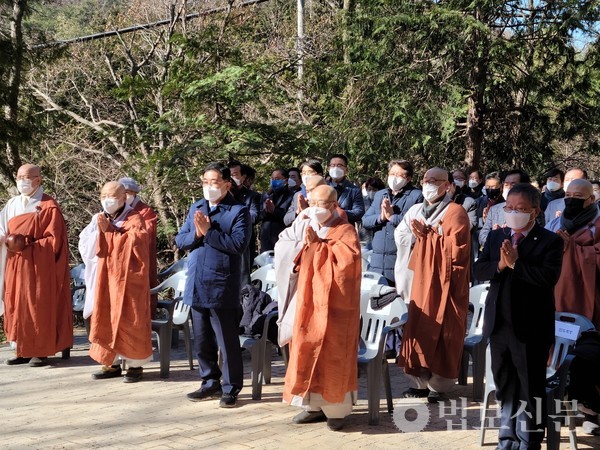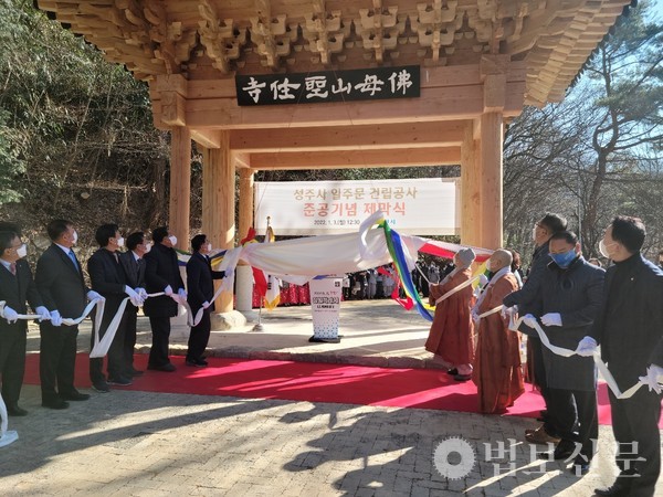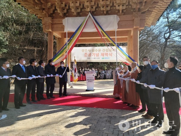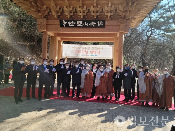 성주사(주지 법안 스님)는 1월3일 사찰 입구에서 ‘성주사 일주문 준공기념 제막식’을 봉행했다. 이 자리에는 성주사 주지 법안 스님을 비롯한 사중 스님들과 허성무 창원시장, 심상동 경남도의회 운영위원장, 정숙이 창원시 문화유산육성과장을 비롯한 창원시 관계자, 김이순 성주사 신도회장 등 신도들이 동참했다.