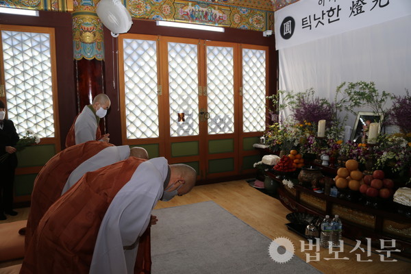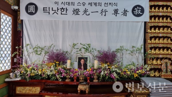 관음사 회주 지현 스님은 조사 형식을 빌린 추모법어에서 “삶과 수행의 길에 이해와 사랑 그리고 평화와 행복의 씨앗을 심어주신 스승님의 가르침은 지금 바로 여기에서 극락정토를 실현하는 것”이라며 “수행의 길에 큰 전환점이 되어주신 스승님의 원적을 애도하며 누구나 참여할 수 있는 추모의 장을 관음사 사부대중이 함께 여법하게 이어갈 것”이라고 밝혔다.