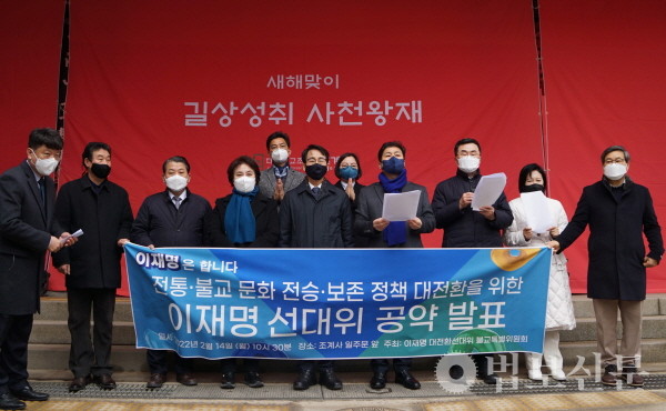이원욱 국회 정각회장을 비롯해 김영배 더불어민주당 전통문화발전특별위원장, 김병주, 소병철, 이수진, 정춘숙 의원 등 전통문화발전문화특위 소속 국회의원과 김상기, 이상곤, 김정숙, 박경수 불교특위 공동위원장 등은 2월14일 오전 서울 조계사 일주문 앞에서 이재명 더불어민주당 대선후보의 불교 공약을 발표했다. 여당 대선후보 측이 조계사 일주문을 찾아 불교 공약을 발표한 것은 이례적이다. 이에 대해 더불어민주당 측 관계자는 “불교 현안을 반드시 해결하겠다는 후보의 강한 의지와 더불어민주당의 진정성을 보이기 위함”이라고 설명했다.