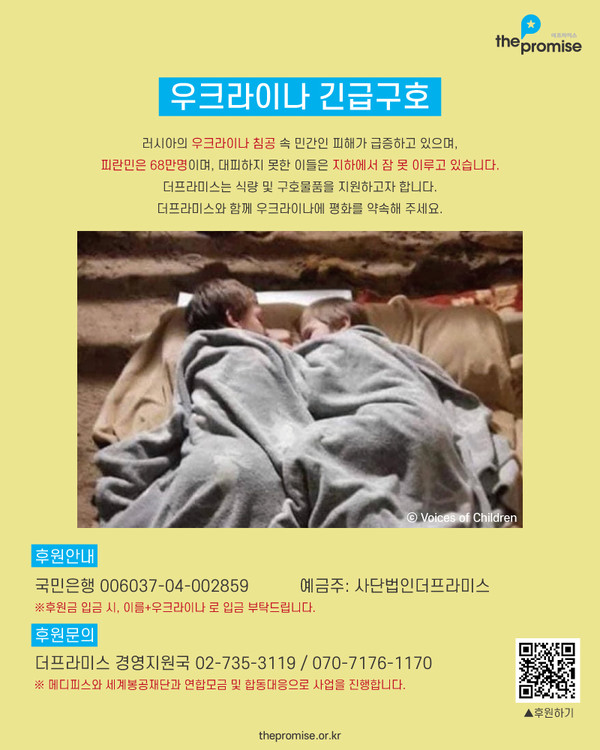 긴급구호는 우크라이나 현지에서 활동하는 단체와 협업해 진행할 계획이며 메디피스, 세계봉공재단 등과 연대해 모금 및 합동대응을 지속할 방침이다. 후원은 후원계좌(국민은행 006037-04-002859 예금주: 사단법인더프라미스) 또는 후원하기 링크(https://bit.ly/3ppeKeh)를 통해 동참할 수 있다. 02)735-3119