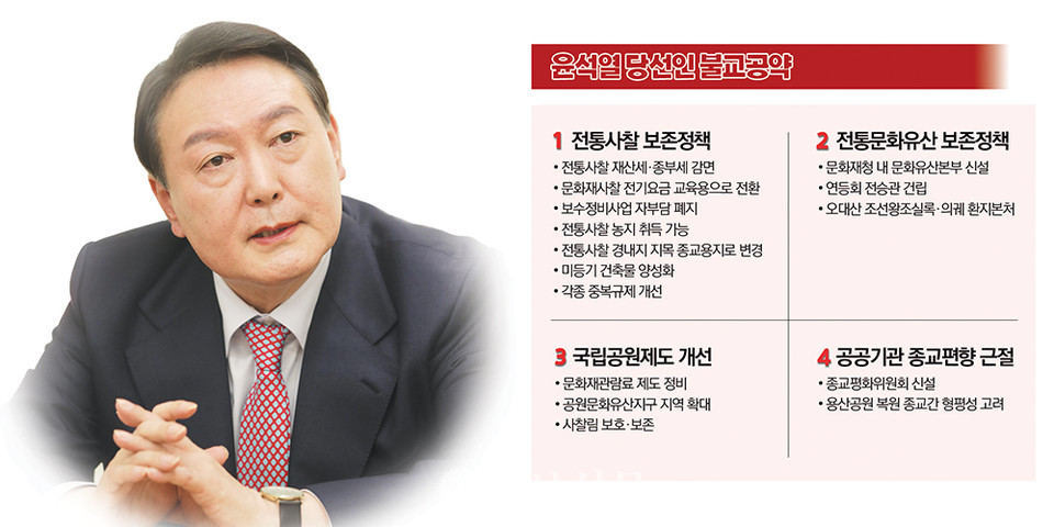 윤 당선인 측은 선거과정에서 2월3일 불교계 현안 해결을 위한 공약을 발표했다. 이 공약은 국민의힘 측이 불교계 민원과 요구사항을 수렴해 선대위 산하에 주호영 의원을 위원장으로 하는 문화유산진흥특위를 구성, 조계종 총무원 및 관련기관, 선대위 정책본부 등과 수차례 검토와 논의를 거쳐 마련됐다. 이에 따르면 국민의힘 측은 불교공약을 △전통사찰 보존 △전통문화유산 보존 △국립공원 제도개선 △공공기관 종교편향 근절의 4개 분야로 나눠 각각의 방안을 마련했다.