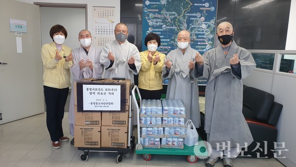 통영불교사암연합회가 코로나19 극복을 위해 방역의 최전선에서 활약하는 보건 의료진에 자비의 공양품을 보시하며 감사와 응원의 뜻을 전했다.