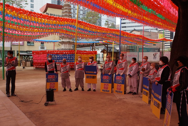 우크라이나에서의 전쟁 중단과 러시아의 민간인 학살을 규탄하기 위해 마련된 이 자리에는 사노위 위원장 지몽 스님과 위원 혜찬·한수·고금·동신·현성 스님을 비롯해 우다야 라이 이주노동자노동조합 위원장, 명숙 인권활동가, 아시아나케이오 해고노동자 등이 참여했다.