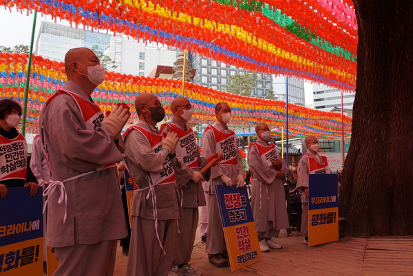 2시간 반을 행진해 목적지에 도착한 스님들은 “우크라이나에 평화를” “전쟁을 멈추고 민간학살 책임져라” 등의 구호를 함께 외친 후 일정을 마무리했다.
