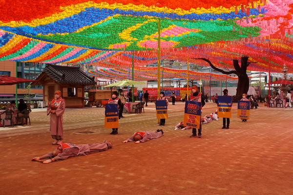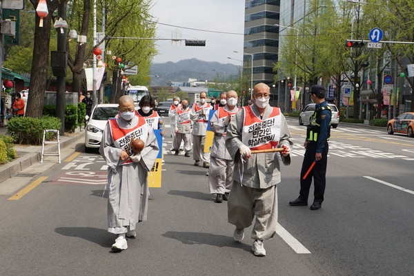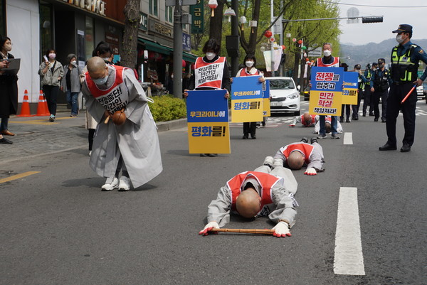 러시아가 우크라이나를 침공한지 48일째인 4월12일 오전 10시30분, 조계종 사회노동위원회(위원장 지몽 스님, 이하 사노위)는 서울 조계사에서 주한 러시아대사관까지 ‘전쟁 중단, 민간인 학살 책임 푸틴 참회, 우크라이나 평화 기원 오체투지’를 진행했다.