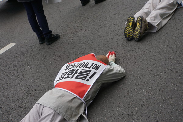 ‘우크라니아에 평화를’이라고 적힌 손팻말을 들고 오체투지 행진에 함께한 명숙 인권운동네트워크 바람 소속 활동가는 우크라이나에 대한 무기 지원보다 러시아에 대한 경제 제재 강화를 통해 전쟁종식을 이끌어야 한다고 주장했다. 명숙 활동가는 “우크라이나에 대한 무기지원은 전쟁을 키울 뿐이다. 우크라이나에 대한 연대가 무기지원이 돼서는 안 된다”며 “러시아가 확실한 위기의식을 가질 수 있도록 경제적 제재를 통해 고립시키는 것이 중요하다”고 밝혔다.